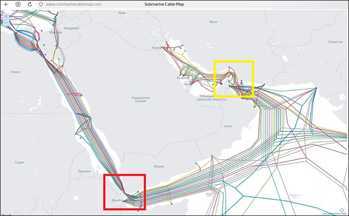 Ключевые интернет-кабели проходят по дну того же самого Ормузского пролива. Скриншот: submarinecablemap.com