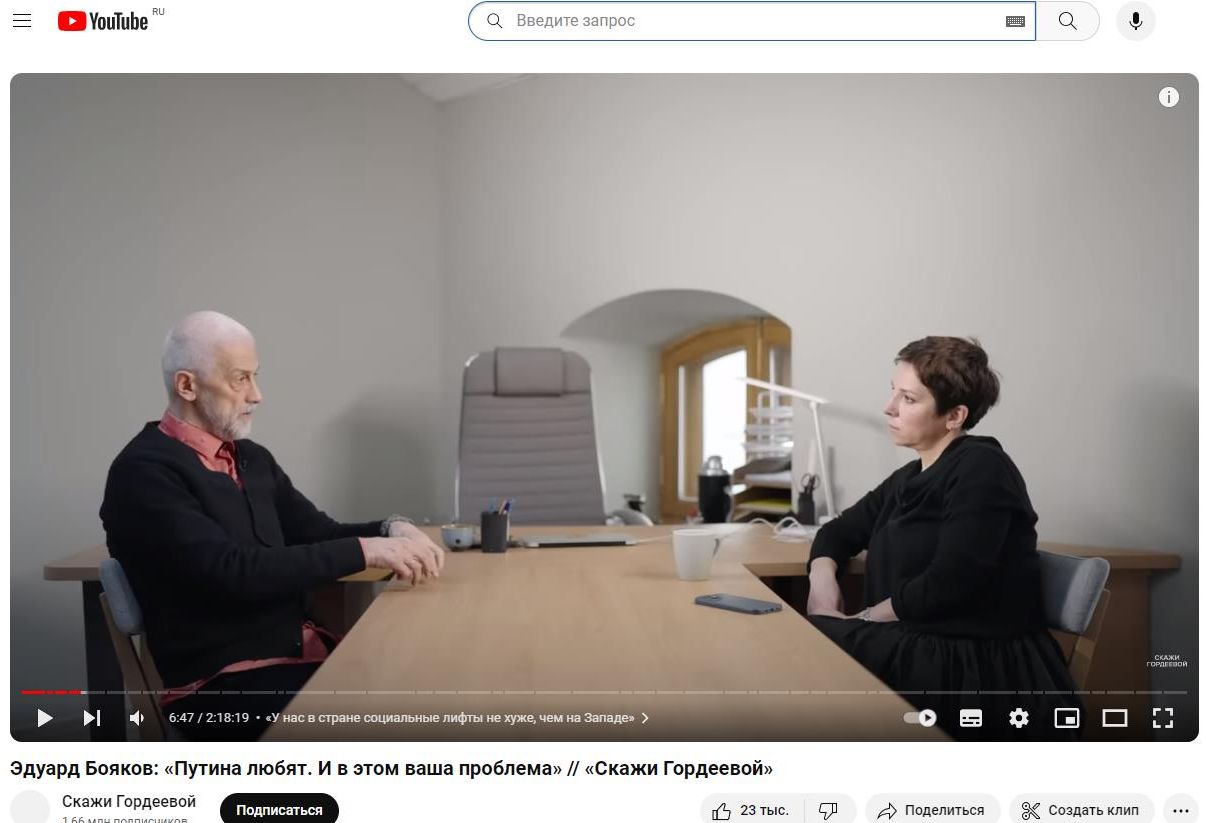 Но порой Гордеева* пытается сыграть "на чужом поле" — вступает в словесный поединок с деятелями культуры патриотических взглядов. Особенно яркой получилась весной 2023-го беседа 46-летней на тот момент журналистки с театральным режиссёром, продюсером, худруком Нового театра Эдуардом Бояковым.