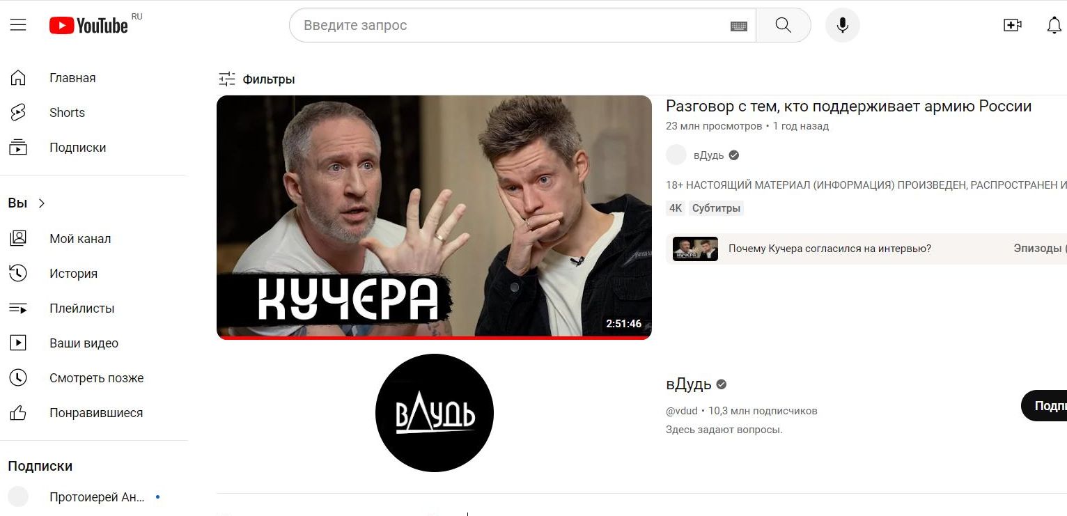 Негативный заголовок интервью с "пропутинским" Кучерой, явно скептический вид Дудя* на заставке — всё уже заранее формирует настроение выпуска. Скриншот: видеохостинг YouTube