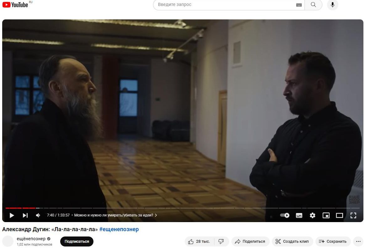Но всё это было в психологическом плане перечёркнуто названием ролика: "Александр Дугин: "Ла-ла-ла-ла-ла". Ззрителям канала сразу был направлен сигнал: не воспринимайте всерьёз слова этого человека, он может говорить что угодно, но он чужой. К тому же это один из редчайших (если вовсе не единственный…) выпусков на канале, к которому отключены комментарии. Что пусть косвенно, но весьма красноречиво характеризует аудиторию канала "ещёнепознер"…
