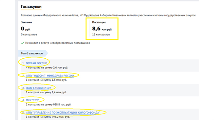 Но такие услуги не единственный источник дохода успешного предпринимателя из Таджикистана. По данным Федерального казначейства, ИП Худойдодов является участником системы госзакупок. В частности, он исполнил 12 контрактов на общую сумму 8,6 млн рублей.