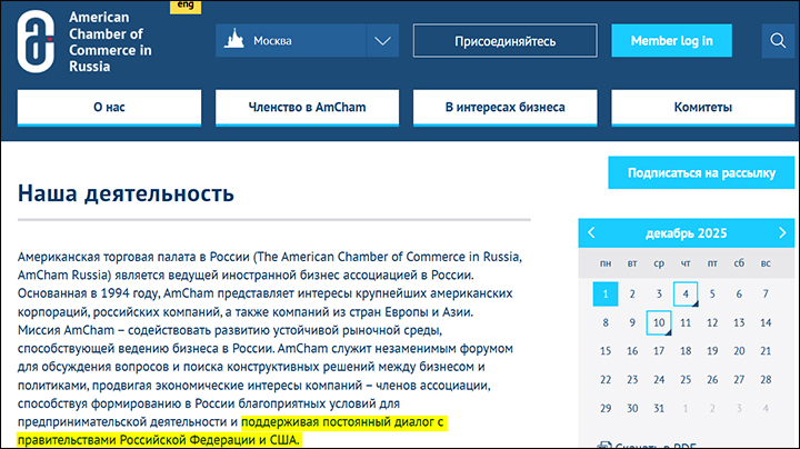 Цель AmCham Russia – лоббирование американского бизнеса в России. Скриншот страницы сайта amcham.ru
