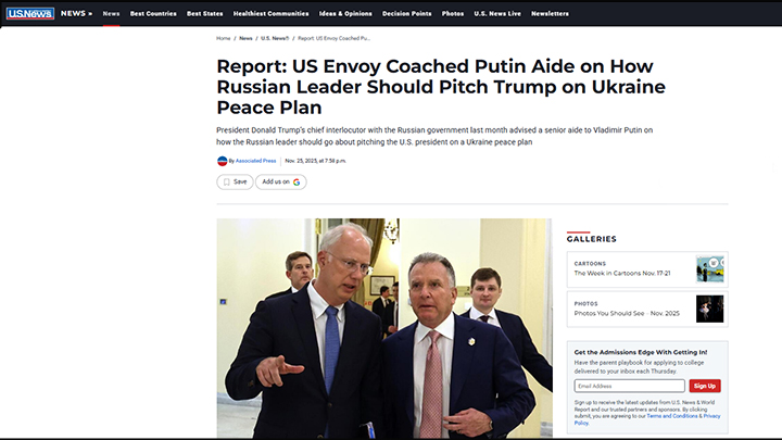 USNews: "Посланник США консультировал помощника Путина, как следует представить российскому лидеру мирный план Трампа по Украине". Скриншот: usnews.com