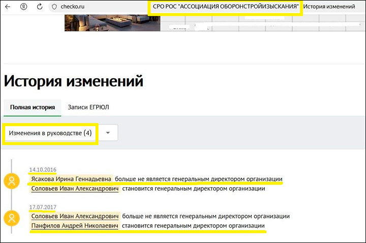 Стандартная схема изменений в руководстве СРО со словом "ОБОРОНСТРОЙ" в названии… Скриншот: интернет-сайт checko.ru