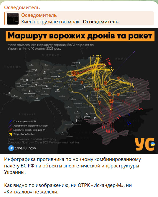 Ближе к 11 вечера 9 октября мониторинговые ресурсы противника сообщили о начале массированного удара по объектам военной, газовой и энергетической инфраструктуры. Около сотни дронов-камикадзе вылетели по направлению к Киеву, и их число продолжало расти в невероятных количествах. После по целям полетело более 20 "Искандеров", а за ними зафиксированы и пуски "Кинжалов".