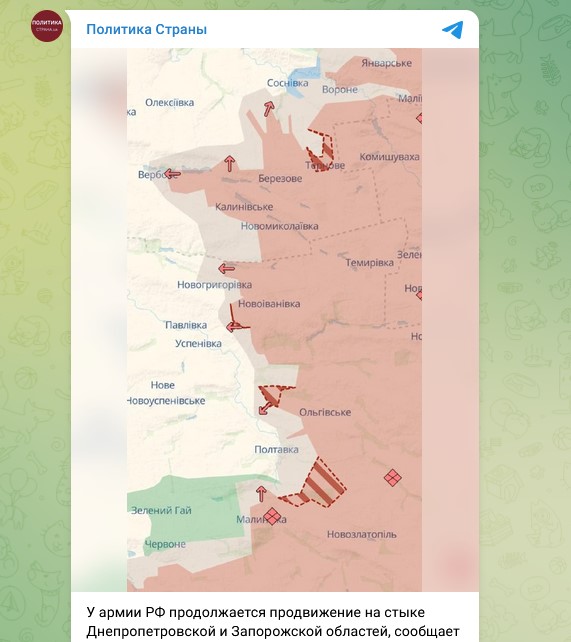 Пока в высших эшелонах ВСУ идёт война за деньги и места, армия России продолжает продвижение на стыке Днепропетровской и Запорожской областей. Русские военнослужащие 6 октября снова продвинулись около Новоивановки и Ольговского, а также около Вишневого и в Терновом, говорится в сообщении украинских военных волонтёров.