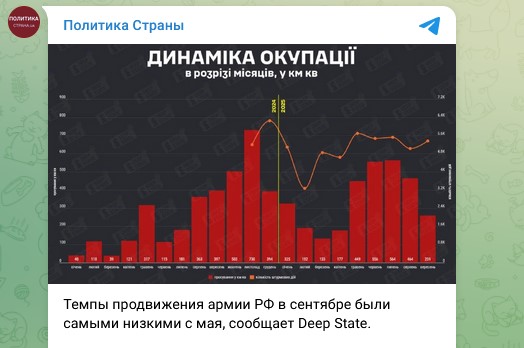 По данным популярного на Украине проекта Deep State, в сентябре темпы продвижения Вооружённых сил России якобы замедлились и стали самыми низкими с мая текущего года. По данным противника, русская армия взяла за месяц под контроль 259 кв. км территорий, "что на 44% меньше, чем в августе". Однако даже при таких данных есть страшные для Киева вести - самое значительное продвижение ВС России зафиксировано в Днепропетровской области. При этом, судя по цифрам, Киев стремительно теряет этот регион.