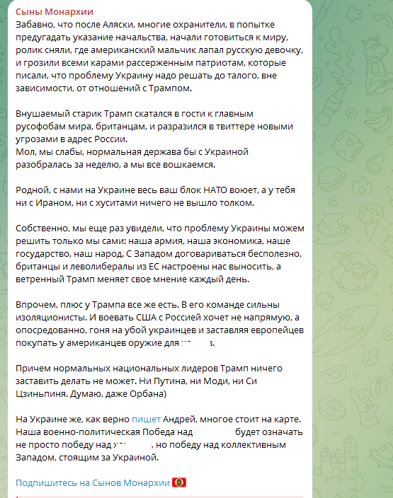 В Сети вспомнили старый ролик - некие авторы создали его сразу после встречи на Аляске Трампа и Путина, когда казалось, что отношения между Москвой и Вашингтоном теплеют небывалыми темпами. На кадрах девушка в одежде цветов русского флага танцевала с юношей американской "раскраски". Но сбылся ролик совсем наоборот. Никакого "договорняка" не случилось, американский президент, кажется, обиделся и недавно пожаловался: мол, Путин его "подвёл". А после поездки в Британию Трампа в Рунете и вовсе окрестили "внушаемым стариком", потому что он внезапно принялся горячо поддерживать Украину и Зеленского.