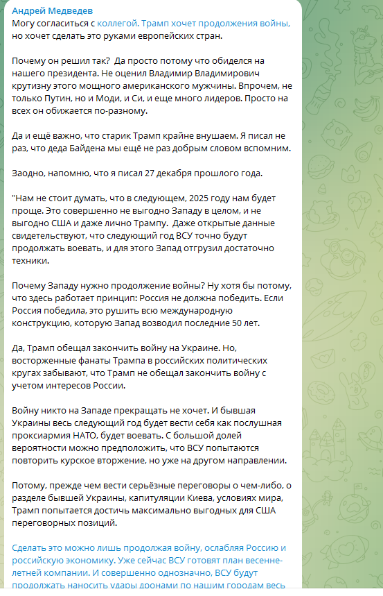 Трамп хочет продолжения войны, но хочет сделать это руками европейских стран. Почему он решил так? Да просто потому, что обиделся на нашего президента. Не оценил Владимир Владимирович крутизну этого мощного американского мужчины. Впрочем, не только Путин, но и Моди, и Си, и ещё много лидеров. Просто на всех он обижается по-разному,