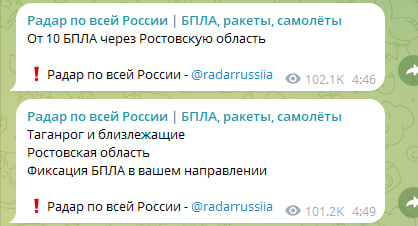 В телеграм-канал «Радар по всей России», отслеживающий активность БПЛА в регионах, сообщили о не менее 10 беспилотников, пролетающих над Ростовской области.