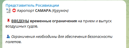 В Росавиации сообщили о временном закрытии аэропорта в Самаре. Введены ограничения на посадку и отправление самолетов в целях безопасности.