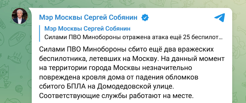 В это же время мэр Москвы Сергей Собянин сообщил о повреждении обломками БПЛА кровли дома.