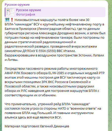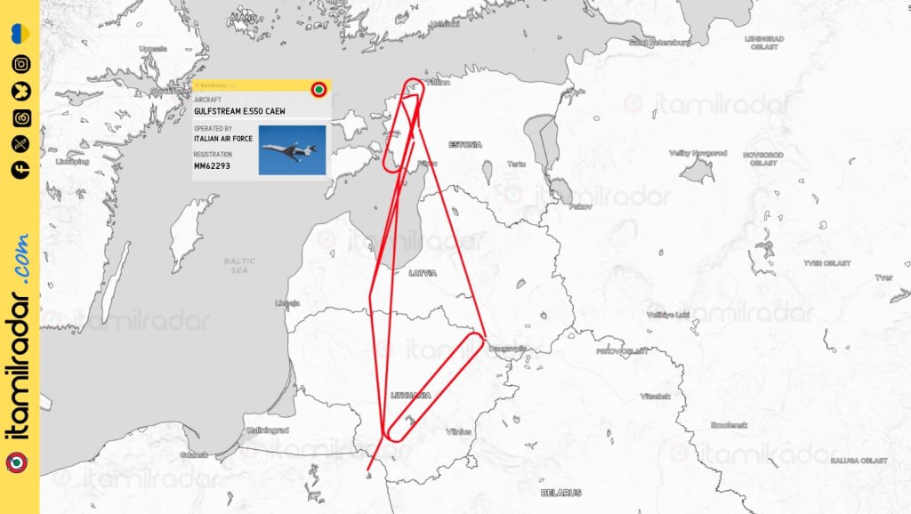 По информации телеграм-канала "Русское оружие" разведывательный самолет ВВС Италии Е-550 с радиолокатором летал над территориями Латвии, Литвы и Эстонии перед массовой атакой украинских беспилотников на Ленинградскую область. Собранные разведанные вероятно передавались ВСУ для построения более безопасных маршрутов ударов, то есть могли быть выстроены так, чтобы обойти места расположения ПВО.