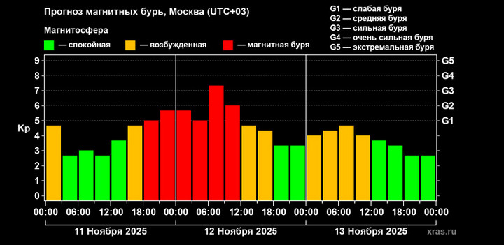 В этом случае бури уровня G1-G2 обрушатся на Землю уже в 18-20 часов по московскому времени. При этом в восточном полушарии будут наблюдаться полярные сияния. Второе облако настигнет планету не позднее утра в среду, 12 ноября. На своем пике эта магнитная буря может достигать уровня G4.