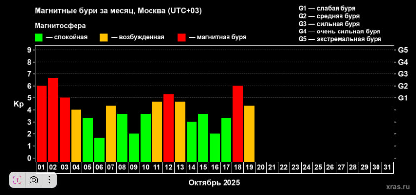Согласно графику эта буря уже третья по счету в октябре. Первая началась 1-го числа и длилась до 3 октября. Вторую магнитную бурю ученые зафиксировали 12 октября.