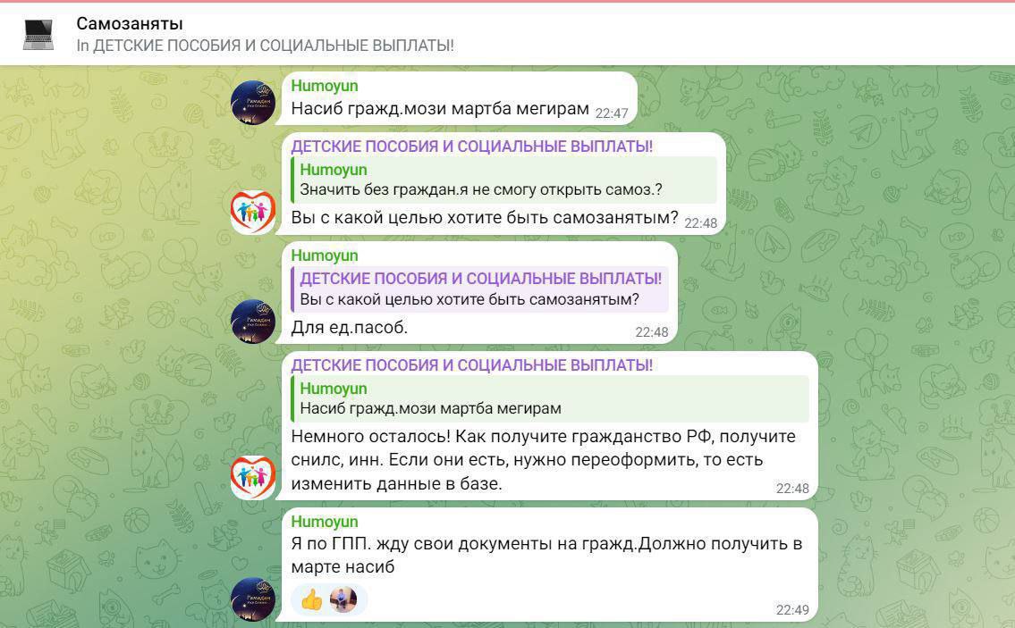 Эта схема расцветает не только в ХМАО. В соцсетях мигранты делятся хитростями: как регистрироваться самозанятыми, чтобы получать кучу выплат, игнорируя налоги и легальный труд. Скриншоты показывают, как семьи платят кредиты за элитное жилье, но продолжают числиться бедняками. Читатели жалуются: одна "специалистка" по пособиям в Сургуте сама живёт во Франции, жирея на барышах от оформления документов. Силовикам пора провести контрольную закупку и размотать всю цепь.
