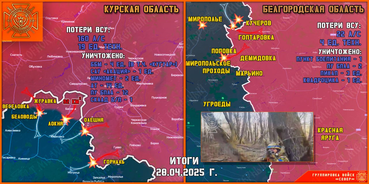 В начале марта 2025 русские войска начали масштабное наступление. 26 апреля после зачистки населенного пункта Горналь русские войска вернули контроль над регионом. Освобождать Курскую область помогали войска КНДР.