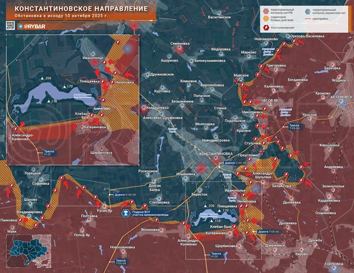 На Константиновском направлении российские войска ведут бои за «карман» к востоку от Ступочек и Белой Горы. Идет наступление на Иванополье, а в районе Клебан-Быка российские силы ранее закрепились по трассе Александро-Калиново — Катериновка. Об этом сообщает «Рыбарь».