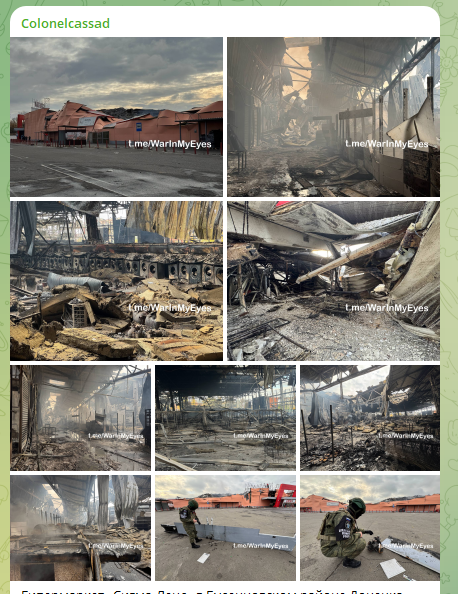 Гипермаркет сгорел, на месте работают следователи СК. Скриншот из телеграм-канала военкора Бориса Рожина.