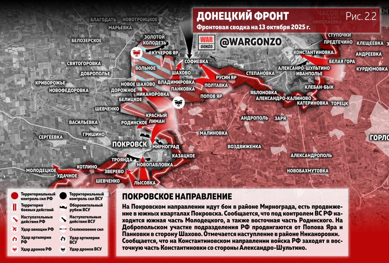 ВСУ начали наступление на некоторых участках, стремясь остановить русские войска и вернуть утраченные плацдармы. В район Покровска срочно направлены две новые бригады. Рассказываем, что происходит на специальной военной операции 13 октября, публикует сводку с фронтов и карты военных действий.