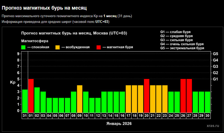 Однако 1 января, а также 20, 26 и 27 числа на Землю все же обрушатся магнитные бури. Предварительно, они достигнут уровня G1 – это самый слабый класс магнитной бури.