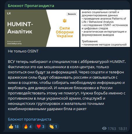 ВСУ теперь набирают и специалистов с аббревиатурой HUMINT. Фактически это как мошенники в колл-центрах, только охотиться они будут за информацией,